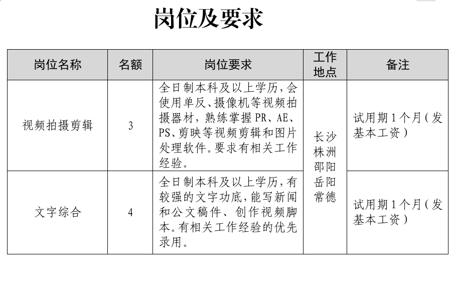 湖南日報融媒傳播有限公司因業(yè)務發(fā)展需要,現(xiàn)面向社會公開招募文案寫作、視頻編輯人才,派遣到省直機關和市州檢察院,從事融媒體相關工作。